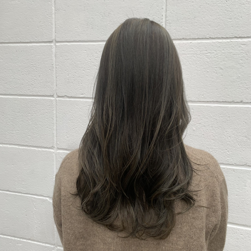 細めのブリーチハイライトを入れた透け感のあるオリーブグレージュです。